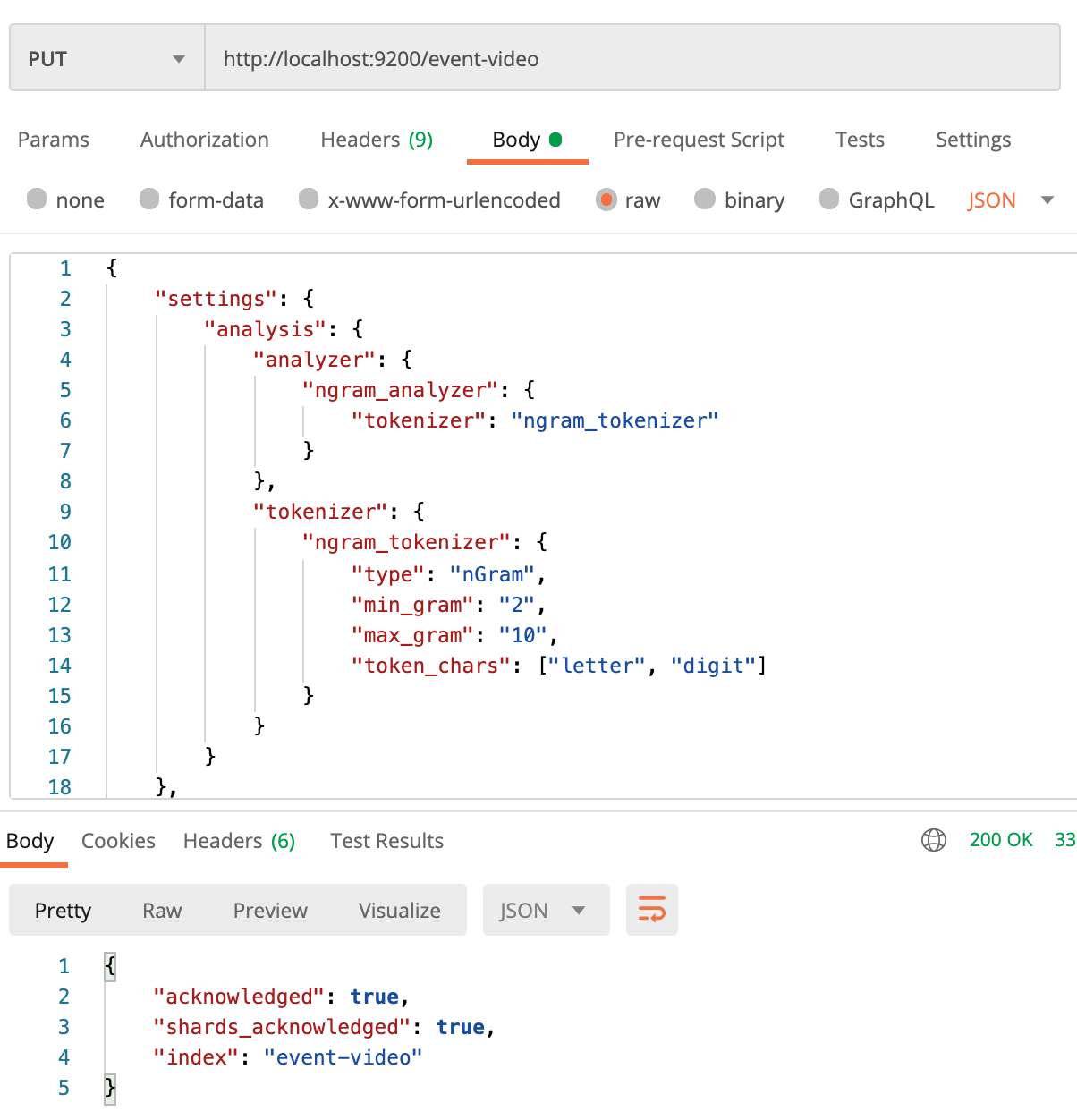 다음으로 아래의 리퀘스트를 보내서 Ngram설정과 동시에 인덱스를 생성한다.