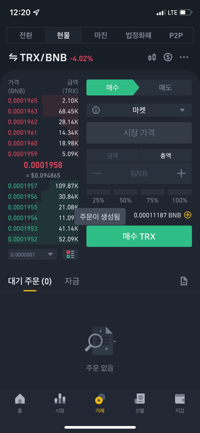 시장 가격에 구매할 예정입니다. 중간에 있는 퍼센티지에서 100%를 선택하고 매수 TRX 버튼을 클릭합니다.