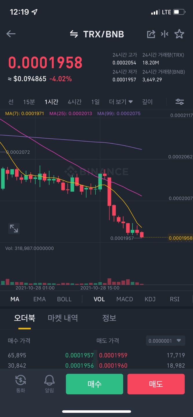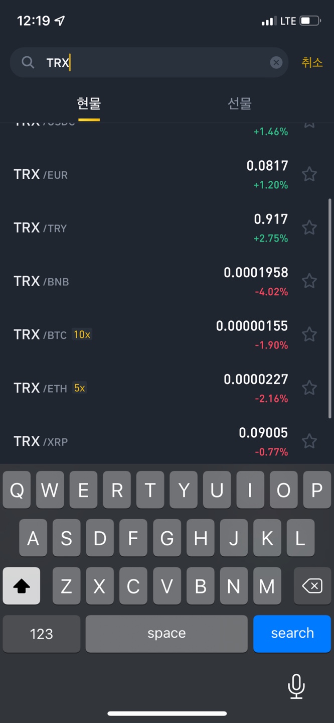 먼저 바이낸스 어플을 키고 하단 5개의 탭(홈/시장/거래/선물/지갑) 중 시장 버튼을 누르고 위처럼 TRX를 입력합니다. 그렇다면 위처럼 여러개의 보기가 나올텐데 본 포스팅에서는 BNB를 통해 구입할 예정이므로 TRX/BNB를 선택합니다.
