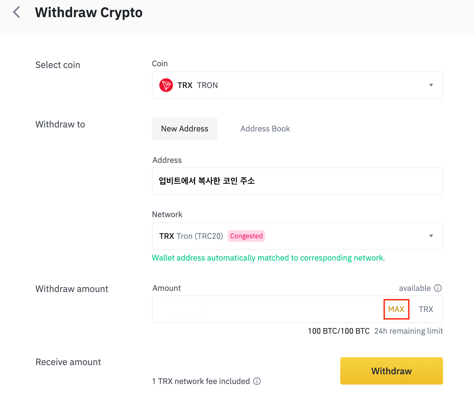 Address 부분에 업비트에서 복사한 트론의 입금 주소를 입력합니다. 그리고 모든 코인을 다 보낼 것이므로 빨간색 네모박스로 표시한 MAX를 누릅니다. 최종적으로 오른쪽 하단에 있는 Withdraw버튼을 누릅니다.