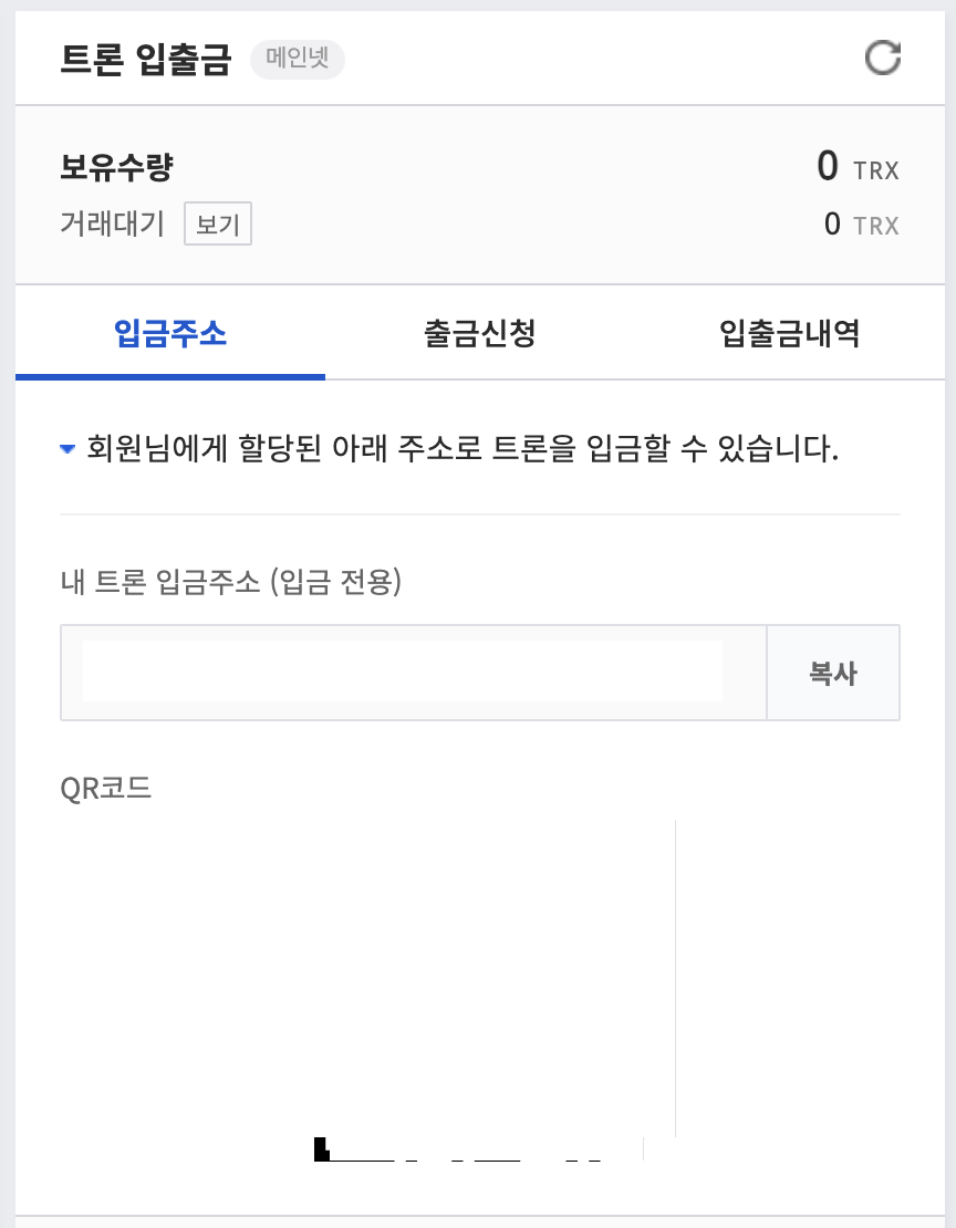 다음으로 업비트 상단 탭 중 2번째에 위치한 입출금 메뉴로 들어가서 TRX를 검색하고 클릭합니다. 그러면 위처럼 입금 주소가 나오게 될텐데요. 이 주소를 복사한다음 바이낸스 사이트에 들어가서 로그인을 진행합니다.
