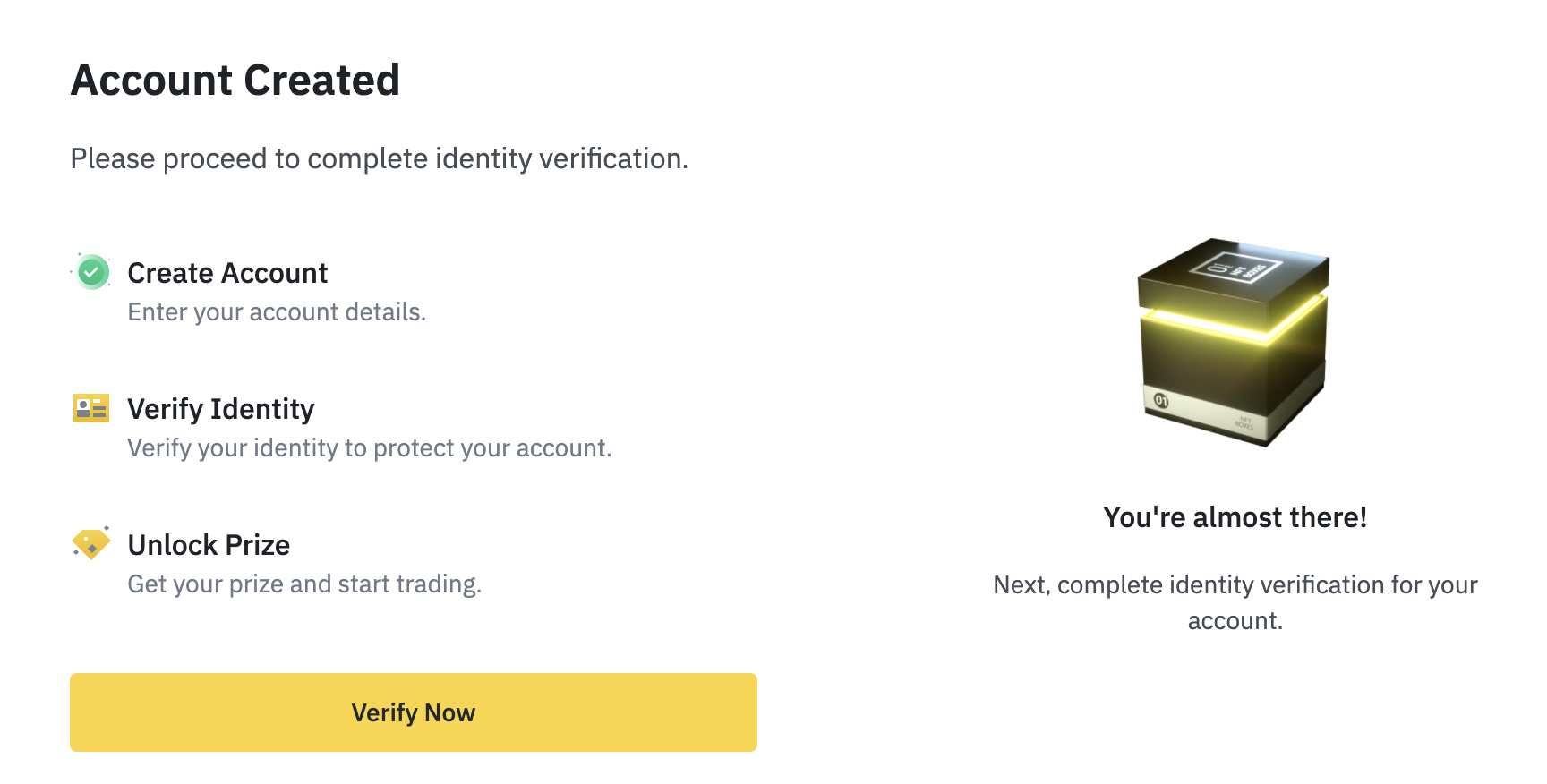 그러면 아마 위 페이지로 이동될텐데요. Account Created라고 나오는 것 처럼 계정이 정상적으로 생성되어 회원가입에 완료한 모습을 확인할 수 있습니다. 하지만 여기서 끝이 아닙니다. 바이낸스 거래소를 정상적으로 이용하려면 몇가지의 인증 절차를 거쳐야합니다. Verify Now 버튼을 누릅니다.