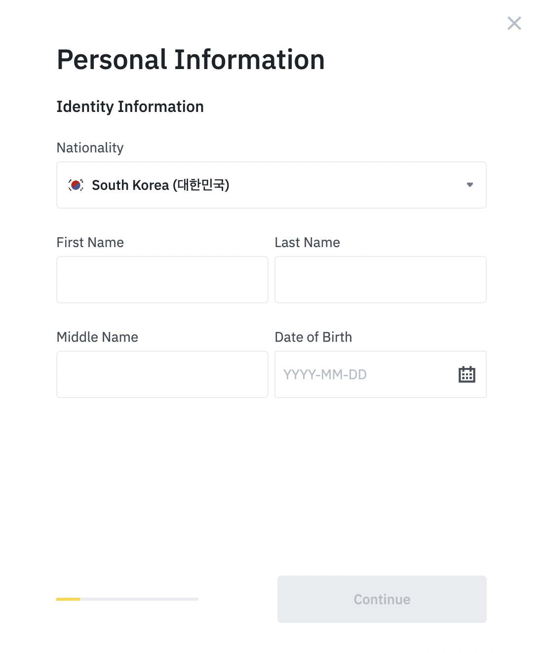 그러면 이렇게 개인정보를 입력하는 창이 하나 뜨는데요. First Name에는 이름을 적어주고 Last Name에는 성을 적어줍니다. 이 때 여권에 표시되어있는 이름과 동일하게 적어주는것이 좋습니다. 이번 스탭이후로 여권을 통해 인증할 수 있는 기능이 존재하기 때문입니다.