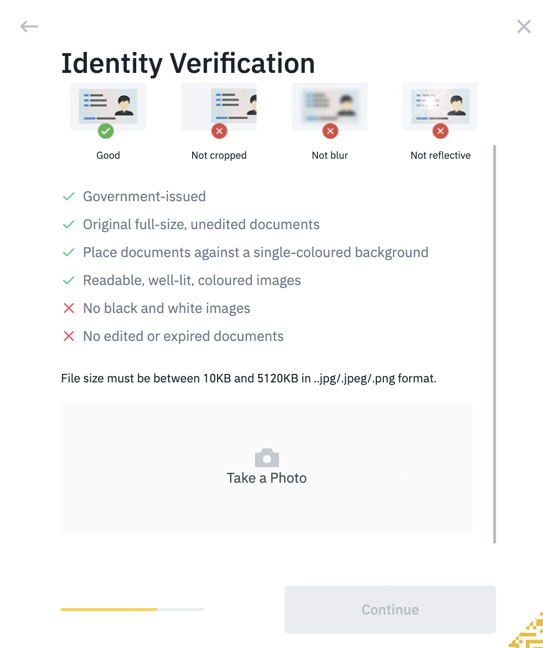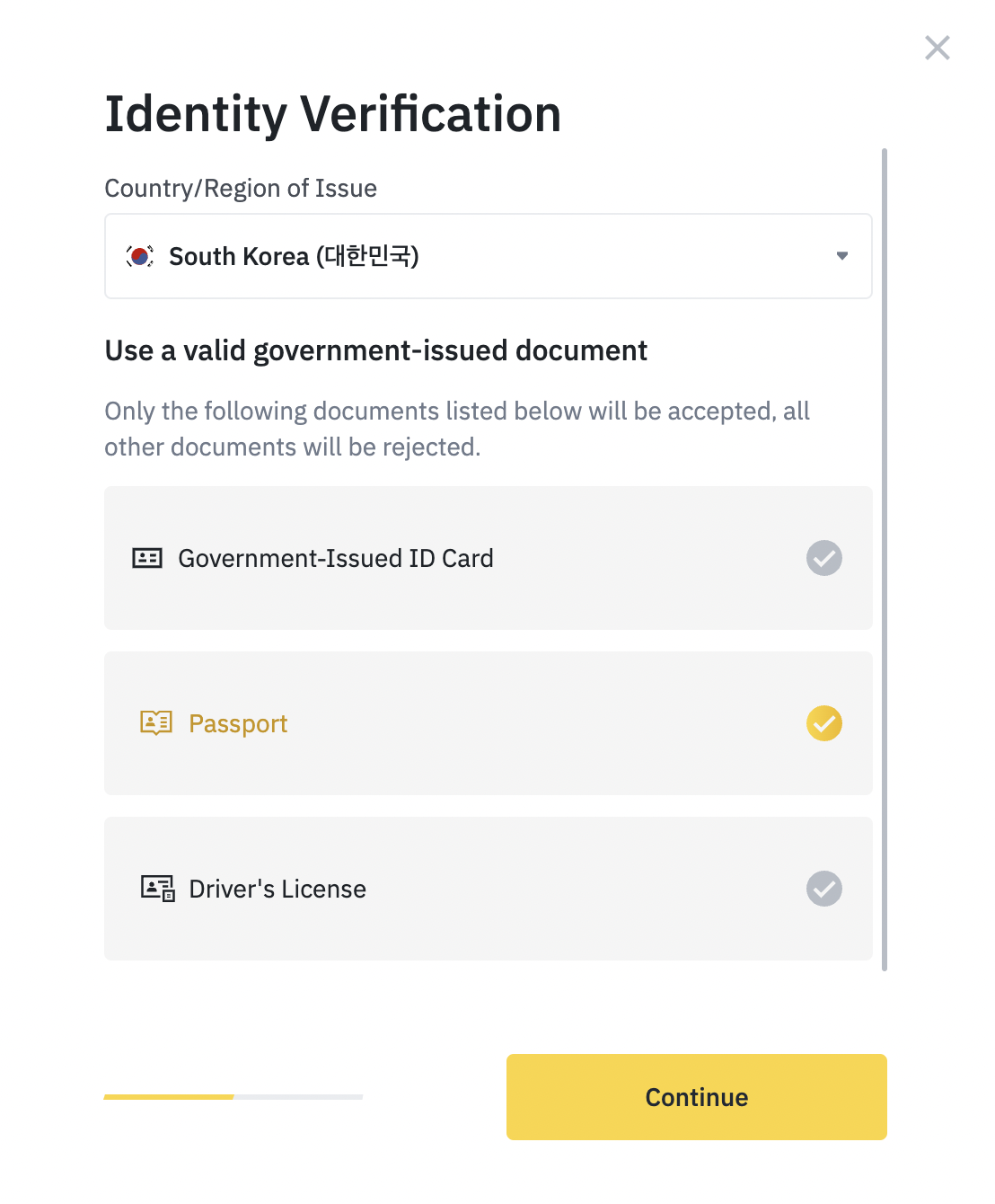 이제 마지막으로 실제 인증을 진행하는 단계입니다. 첫 번째(Government-Issued ID Card)는 신분증으로 인증을 하는 버튼이고 두 번째(Passport)는 여권을 통한 인증입니다. 마지막 세 번째(Driver's Licence)는 운전면허증을 활용한 인증입니다. 여기서는 두 번째에 있는 여권을 통한 인증을 진행하겠습니다. 해당 인증이 가장 빠른것을 실제 체감했기 때문인데요. 속도를 제외하고는 다음 단계에 나오는 인증 방식이 여권과 모두 동일하기에 신분증이나 운전면허증을 통해 인증을 시도하는 유저분들도 본 포스팅에 나와있는 내용을 똑같이 진행하시면 되겠습니다. Continue를 눌러 다음 단계로 넘어갑니다.