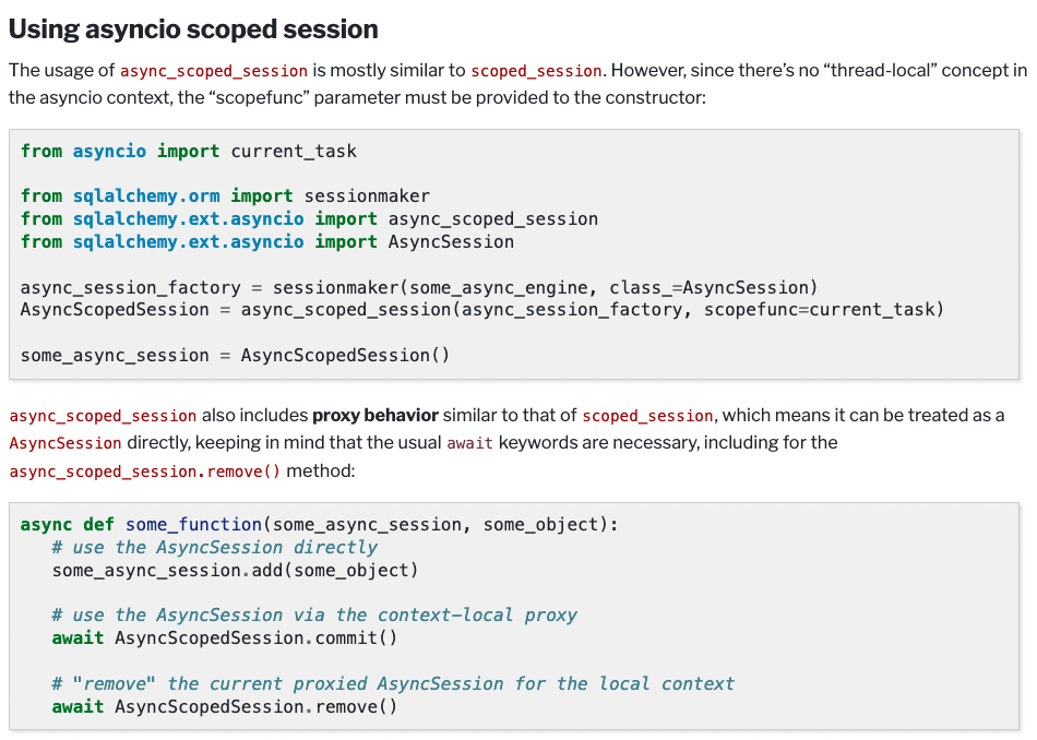 SQLAlchemy 공식문서에서 async_scoped_session() 메소드 관련 문서를 찾아보면 위와 같은 글을 찾을 수 있다. 주목할점은 scopefunc인자에 asyncio의 current_task를 넣어준다는 점이다. scoped_session()의 scopefunc인자에 값을 대입하는 경우 registry라는 딕셔너리를 통해 세션을 관리하게 된다. 이 때 scopefunc에 인자로 넣어준 함수의 리턴값을 registry 딕셔너리의 키값으로 대입하여 사용할 세션을 결정한다.