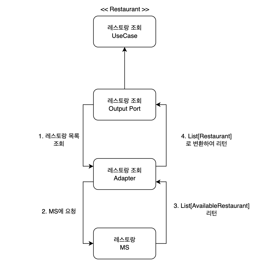 - 레스토랑 조회 유즈케이스에서는 Output Port를 통해 레스토랑 조회 요청을 보냅니다.