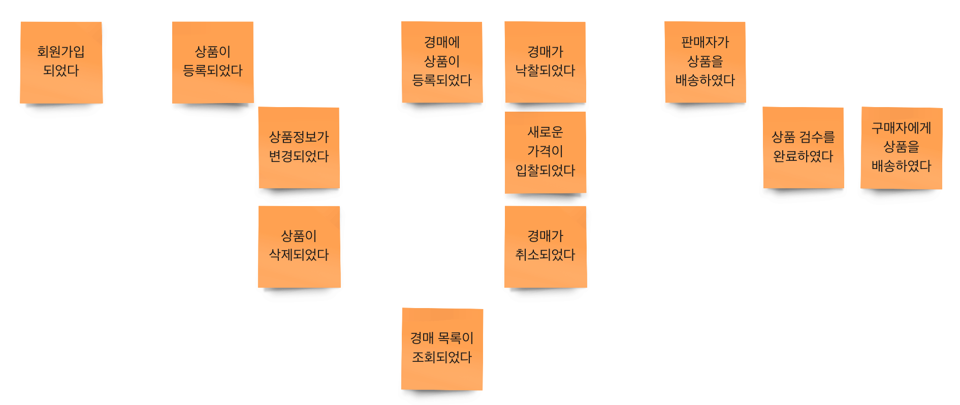 도메인 이벤트는 과거에 일어났던 일을 표현하기 위해 과거 시제를 사용하며 이벤트가 발생한다는 것은 상태가 변경되었음을 의미한다. 본 단계에서 모든 이벤트를 추출하지 않아도 괜찮다. 단계를 진행하며 추가적으로 도출되는 이벤트는 그때마다 추가해도 된다.