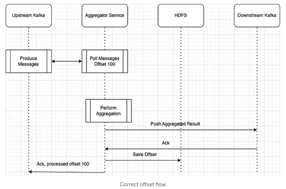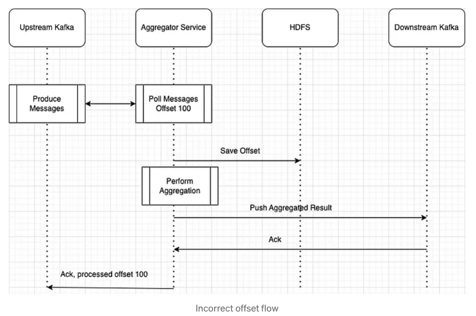 그러나 문제는 어그리게이트 결과를 카프카에 밀어넣기 전 오프셋을 저장하는 부분에서 발생한다. 오프셋을 저장한 후 어그리게이터가 실패하면 어떻게 될까? 처리된 모든 데이터는 유실되며 오프셋이 커밋되었으므로 어그리게이터는 유실된 데이터를 다시 처리하지 않는다. 그러므로 카프카에 데이터를 밀어넣은 이후 오프셋을 저장해야한다.