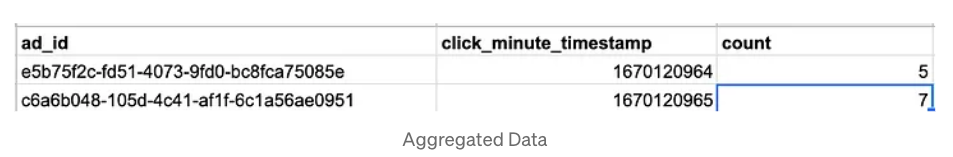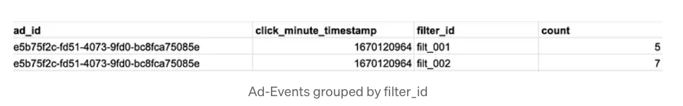 필터를 적용하여 쿼리할 때 많은 연산이 발생하지 않게 하기 위해 로우 데이터를 특정 포맷에 맞게 저장하는것 또한 필요하다. 우리는 모든 ad_id 및 click_minute에 대해 filter_id별로 그룹핑하고 집계된 수를 저장해야한다.