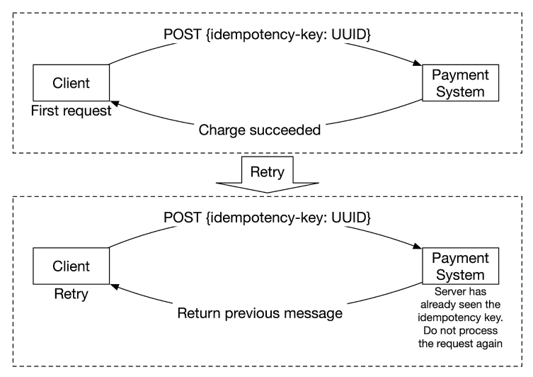 이중 결제를 피하기 위해 결제는 정확히 한번만 발생해야한다. 이러한 최대 1회 보장을 멱등성이라고도 부른다.