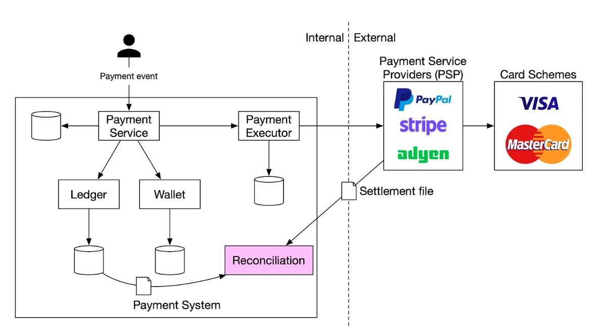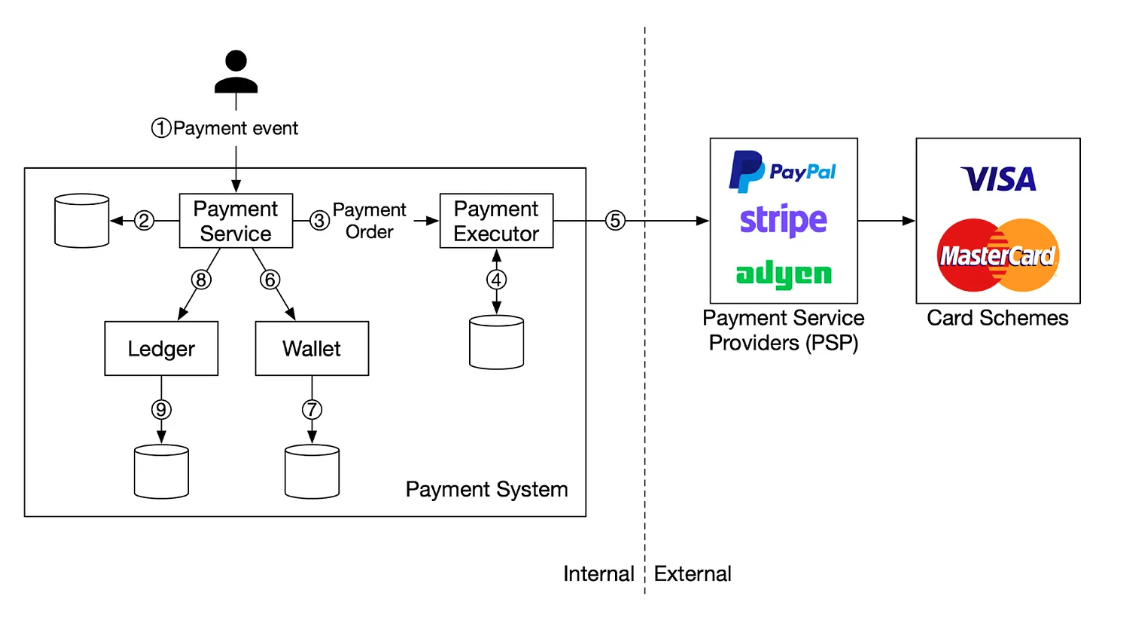 위 그림에서는 간소화를 위해 payment executor, ledger, wallet을 제외시켰다. 결제 서비스는 아래의 전체 결제 프로세스를 관장한다.