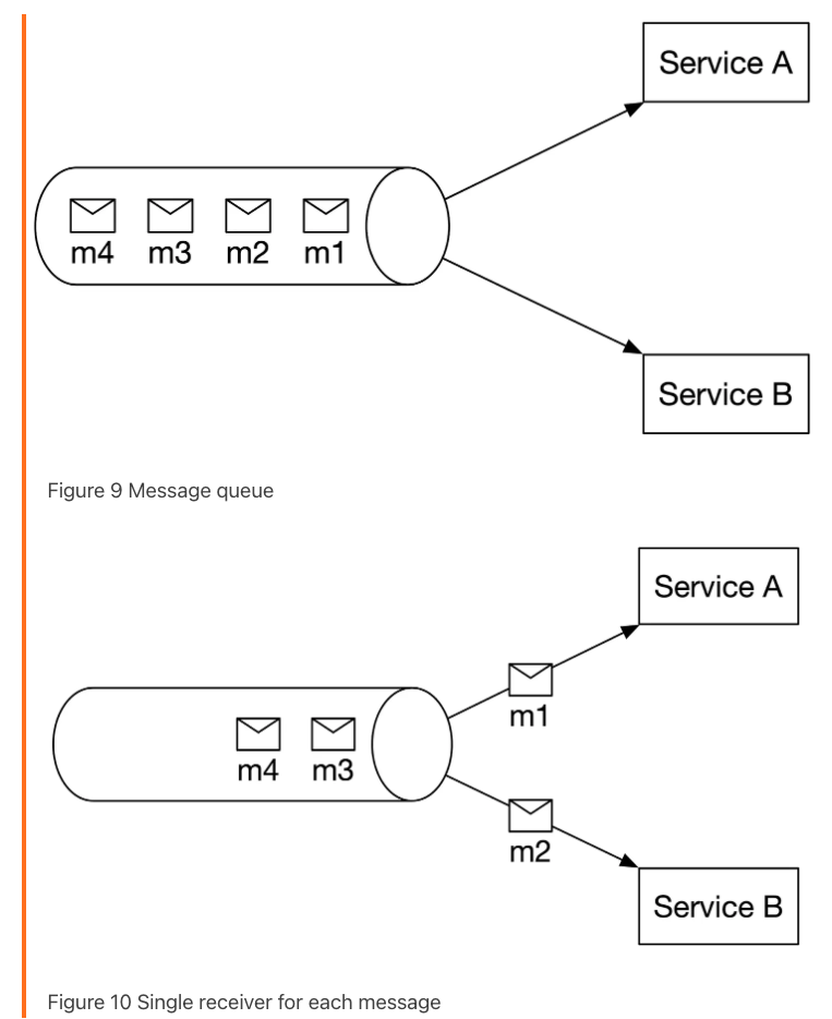 - 단일 수신기: 각 요청은 하나의 수신기 또는 서비스에서 처리된다. 이는 일반적으로 공유되는 메시지 큐에 의해 구현된다. 메시지 큐는 여러명의 구독자를 가질 수 있지만 메시지가 처리되면 그 즉시 큐에서 삭제된다. 구체적인 예를 한번 살펴보자. Figure 9에서 서비스 A와 B는 공유 메시지 큐에 대한 구독자이다. m1과 m2가 서비스 A와 B에서 각각 소비되면 Figure 10에 표시된 대로 두 메시지 모두 큐에서 제거된다.
