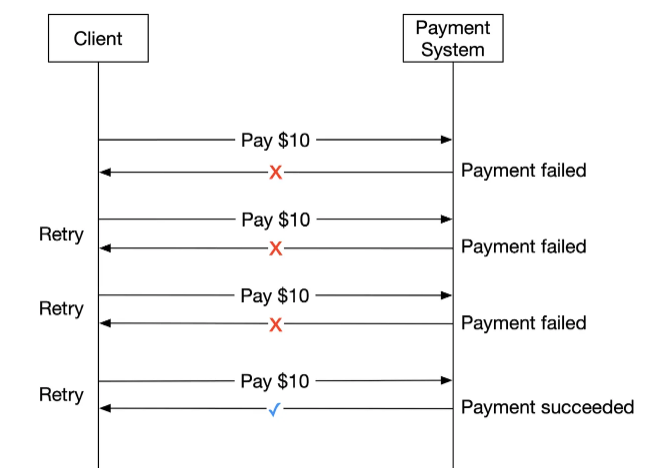 때때로 네트워크 타임아웃등의 오류로 인해 결제를 재시도할 필요가 생긴다. 재시도는 적어도 한번을 보장한다. Figure 13에서 클라이언트가 10달러 결제를 시도했는데 네트워크 이슈로 인해 해당 결제 건이 실패하였다. 이 예제에서 네트워크는 결국 복구되며 결제는 4번의 시도끝에 결국 성공했다.