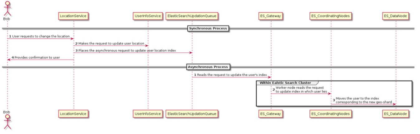 위치 샤드 인덱스를 포함하고 있는 ElasticSearch 클러스터는 큐에서 메시지를 읽고 유저 인덱스를 업데이트한다. ElasticSearch의 탄력적인 노드는 사용자의 정보를 기존 매핑된 인덱스에서 새 위치에 매핑된 인덱스로 이동시킨다. 이를 통해 유저가 위치를 옮겼을 때 새로운 위치의 추천목록에 뜰 수 있도록 한다.