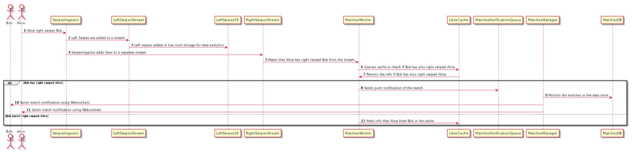 반면 오른쪽 스와이프는 분리된 스트림으로 전송되며 매칭 워커 스레드에 의해 읽히게 된다. 매칭 워커 스레드는 스트림을 통해 좋아요 메시지를 읽고 해당 데이터가 LikesCache에 존재하는지 확인한다. 예를 들어 위 이미지에서 Alice가 Bob에게 좋아요를 보내면 매칭 워커는 Bob이 Alice를 좋아한다는 정보가 캐시에 있는지 확인한다. 만약 Alice와 Bob이 서로 좋아요를 보낸 경우 이를 매칭되었다고 표현하며 웹 소켓을 통해 각 유저에게 푸시 알림을 전송하게된다. 만약 Bob이 아직 Alice에게 좋아요를 보내지 않았다면 Alice가 Bob을 좋아요했다는 정보가 LikesCache에 저장된다.