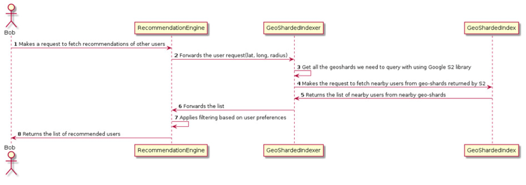 이전 섹션에서 어떻게 유저가 위치 샤드 인덱스에 추가되는지 살펴봤다. 이제 유저가 다른 유저의 추천 항목에 어떻게 뜨게 되는지 살펴보자. 추천 엔진은 유저의 요청이 오는 경우 이 요청을 GeoShardedIndexer로 전달한다. 그리고 GeoShardedIndexer는 구글 S2와 같은 라이브러리를 통해 유저 위치 및 반경을 기반으로 어떤 샤드로 요청할 지 결정한다. 그런 다음 GeoShardedIndexer는 S2에서 반환한 샤드에 매핑된 모든 위치 샤딩 인덱스를 쿼리하여 해당 인덱스에 존재하는 모든 유저 목록을 가져오고 해당 목록을 RecommendationEngine에 반환한다. RecommendationEngine은 유저의 설정에 따라 필터링을 적용하여 최종 추천 목록을 유저에게 반환한다.