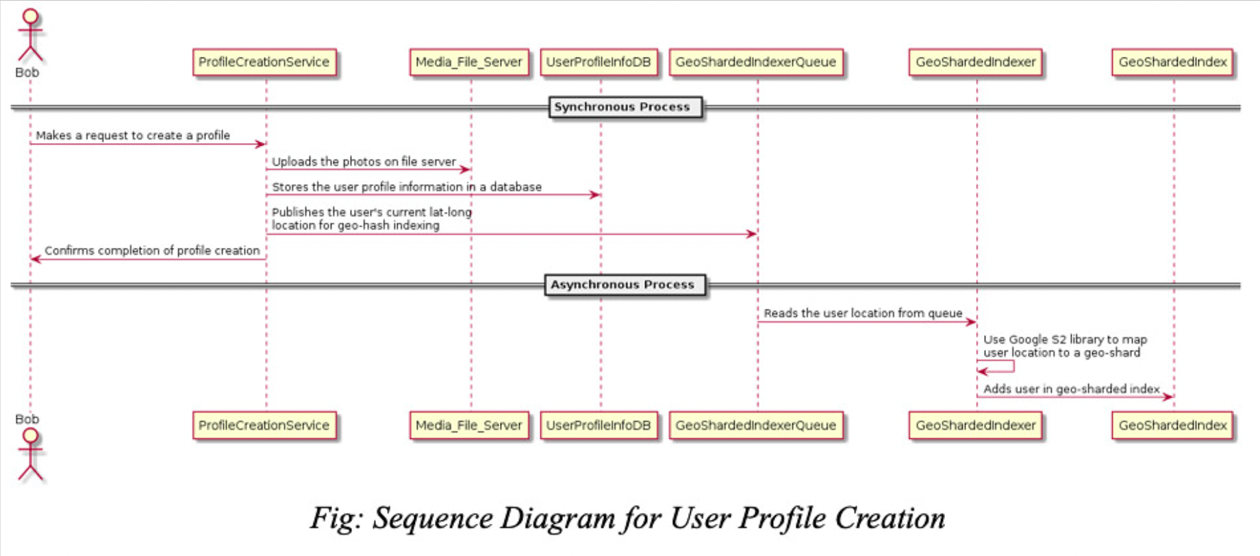 위 다이어그램은 유저가 프로필을 생성했을 때의 흐름을 나타낸다. 동기 프로세스에서 유저의 사진과 같은 미디어 파일은 파일 서버로 업로드되며 유저의 위치를 포함한 정보들은 Key-Value 저장소인 AWS DynamoDB에 저장된다. 추가적으로 위치 샤딩 인덱스에 유저를 추가하기 위해 큐에 추가된다.