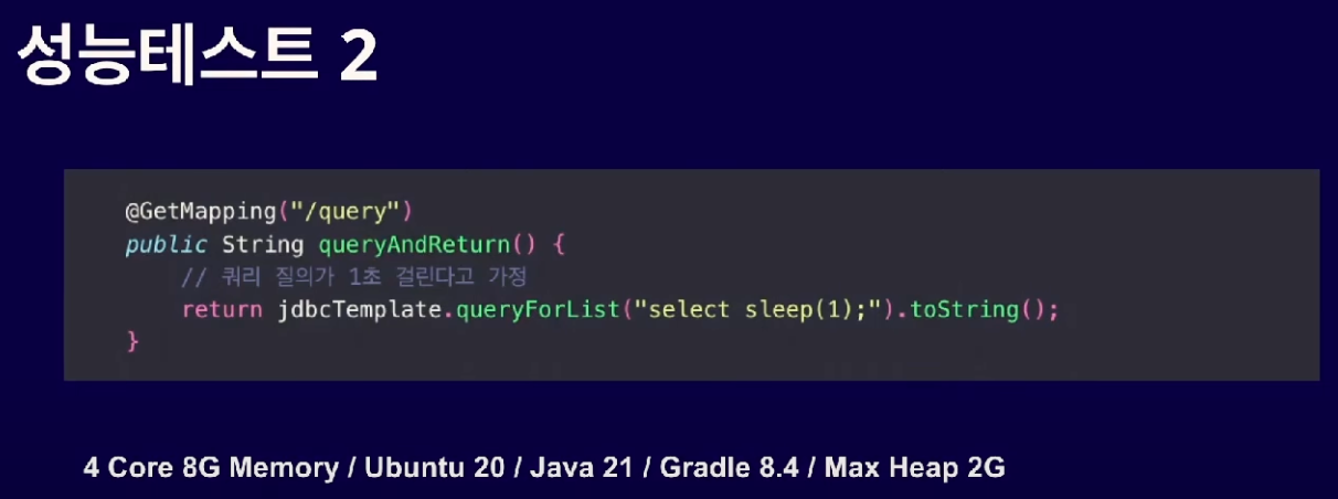 두 번째 성능 테스트는 실제 DB에 쿼리하여 1초를 대기하는 작업이다. Platform Thread의 경우 MySQL의 Max connection이 기본 150이기에 해당 값에 근접하는 TPS를 보여준다.