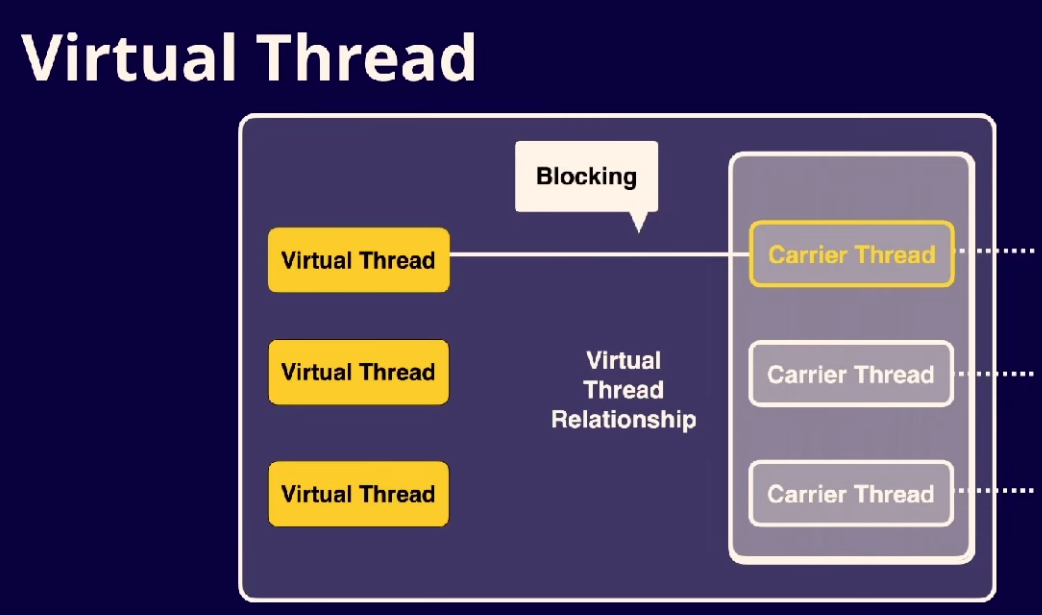 - Virtual Thread는 기다림에 대한 개선이다. IO 블락킹이 발생했을 때 Virtual Thread와 연결된 Carrier Thread의 대기 시간을 해소시켜 높은 처리량을 가져오게 하는 것이다.