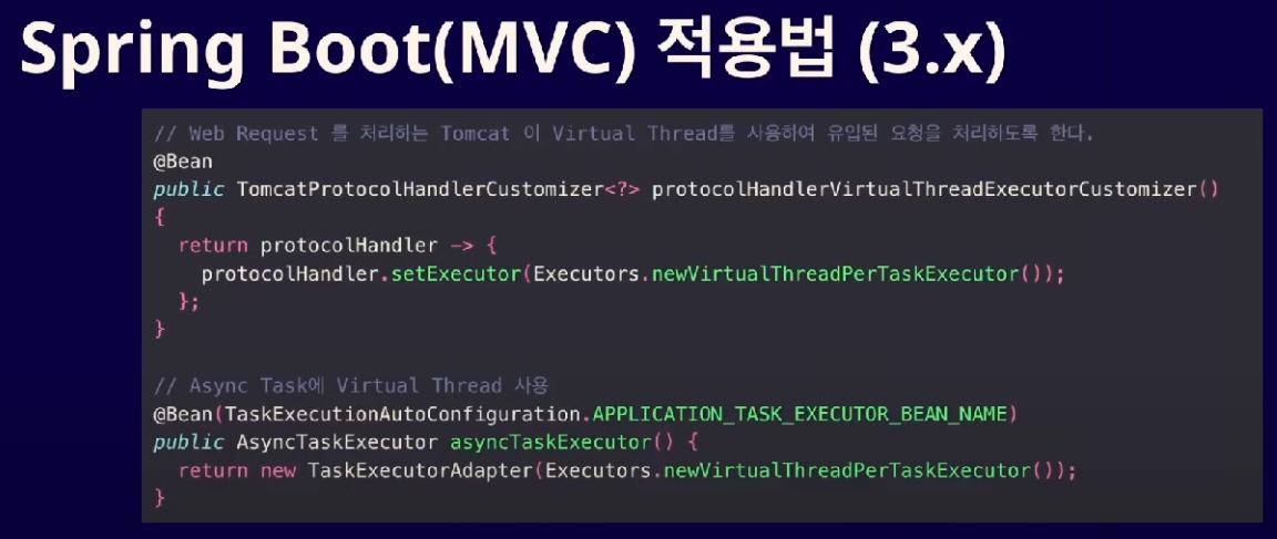 위와 같이 설정하면 내부에서 발생하는 톰캣/WAS에 대한 처리를 Virtual Thread가 수행하도록 해준다.