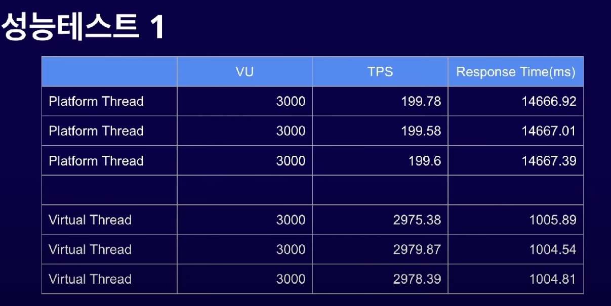 톰캣 기본 스레드 수가 200이기 때문에 Platform Thread의 경우 해당 값에 근접한 TPS가 도출됐다. 반면 Virtual Thread의 경우 TPS가 3000에 가까운 수치임을 확인할 수 있다. 이는 단순 sleep만 있는 코드이긴 하지만 IO블락킹이 있는 코드에 Virtual Thread를 사용하면 상당히 큰 효과를 얻을 수 있음을 의미한다.