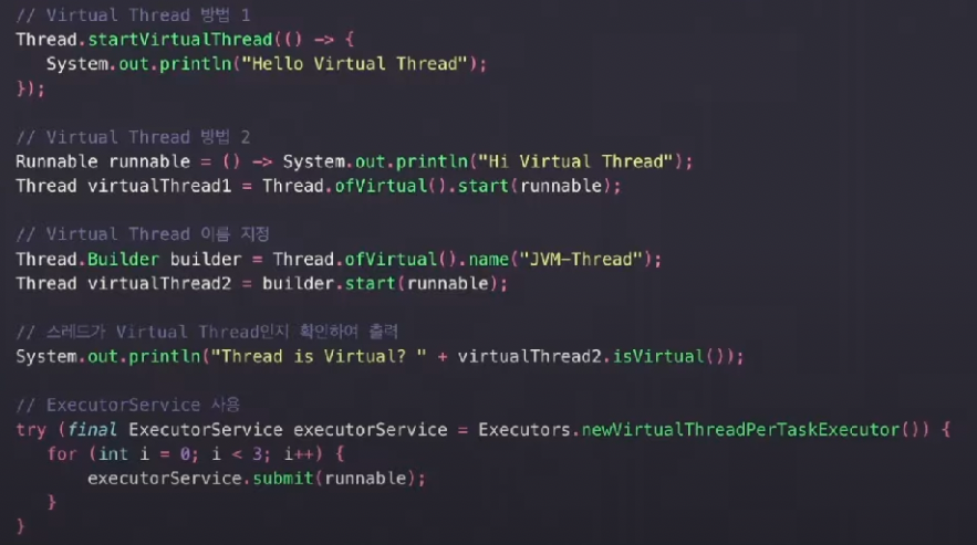 - Virtual Thread는 Platform Thread를 대체하려는 것이 아님, 둘다 사용 가능