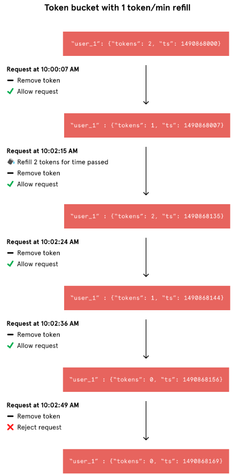 각 유저별로 마지막 요청의 타임스탬프와 잔여 토큰 수를 해시 자료구조로 저장한다. user_1은 버켓에 2개의 잔여 토큰이 있으며 Thursday, March 30, 2017 at 10:00 GMT에 마지막 요청을 보냈다.