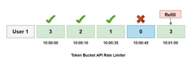 - 네 번째 요청이 10:00:45에 왔지만 잔여 토큰이 없기 때문에 해당 요청은 거부된다.
