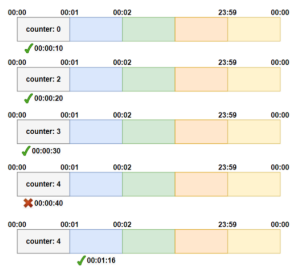 만약 요청이 2:50AM에 온다면 현재 버켓을 포함한 마지막 3개의 버켓에서 총 요청 수를 계산한다. 위의 경우 요청 수가 60으로 합산된다. (보통 100보다 작음) 따라서 새로운 요청이 2:40AM ~ 3:00AM 버켓에 추가된다.