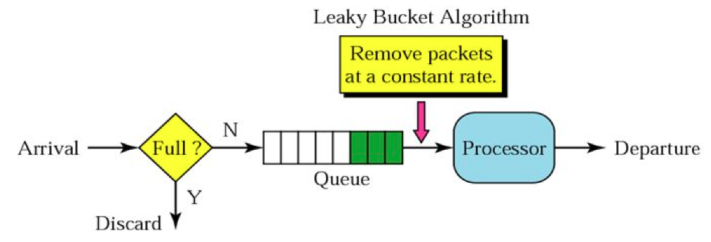 Leaky 버켓 알고리즘의 버켓 크기는 큐의 크기와 동일하다. 그리고 큐는 고정된 속도로 요청을 처리한다.
