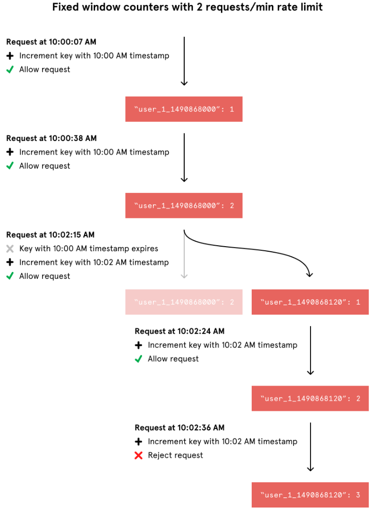 user_1은 2017년 3월 30일 10:00:00 ~ 10:00:59 사이에 1개의 요청을 보냈다. 위 레디스 키에는 2017년 3월 30일 10:00:00부터 2017년 3월 30일 10:00:59 타임스탬프 사이의 모든 항목이 포함된다. 예를 들어 2017년 3월 30일 10:00:10와 2017년 3월 30일 10:00:20에 발생한 모든 요청의 레디스 키는 2017년 3월 30일 10:00:00 타임스탬프에 포함된다. 이것이 레디스 명령을 원자적으로 만드는 이유이다.