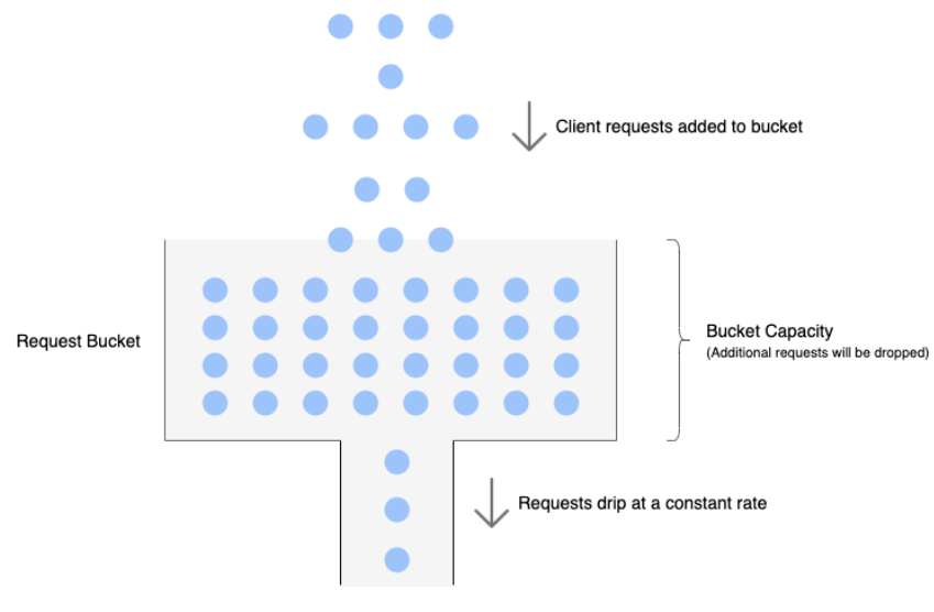 토큰 버켓과 유사하게 Leaky 버켓에도 각 클라이언트 별로 사전에 정해진 용량이 존재한다. 그러나 토큰 버켓 알고리즘과는 다르게 Leaky 버켓은 클라이언트의 요청에 의해 버켓에 토큰이 채워진다. 그리고 요청은 버켓에서 일정한 속도로 꺼내어 처리된다. 요청이 도착하는 속도가 처리되는 속도보다 빠르면 버켓에 공간이 생길 때 까지 추가 요청은 버려진다.