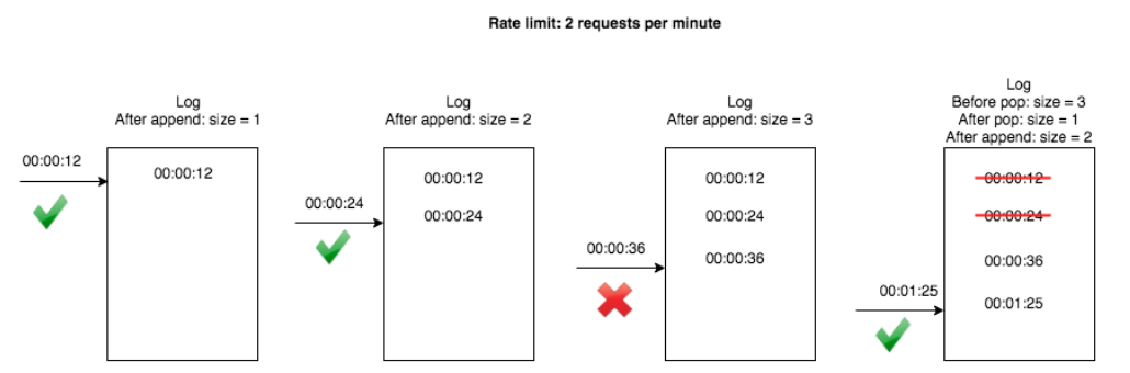 - 이 알고리즘은 요청의 타임스탬프를 지속적으로 추적한다. 타임스탬프 데이터는 레디스의 Sorted Set과 같은 자료구조를 통해 저장된다.