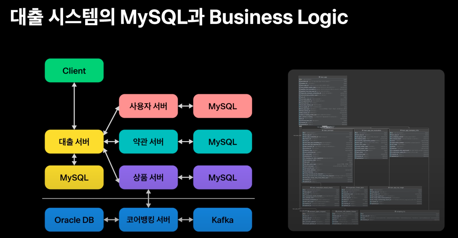 대출이 실행되기까지 필요한 서비스를 간략하게 살펴보더라도 사용자/약관/상품/대출 서버마다 독립된 스키마를 가지게 되었기 때문에 관리의 문제가 발생할 수 있다. 각 서비스마다 담당하는 개발자가 있지만 협업없이 이렇게 큰 시스템을 유지할 수는 없다. 협업을 위해서는 현재 서버에 구성된 스키마를 언제든지 복제하여 생성하고 Version Control System과 연동되어 DDL쿼리의 버전이 관리되어야 하며 비즈니스 로직과 스키마의 동기화를 구현해야한다.