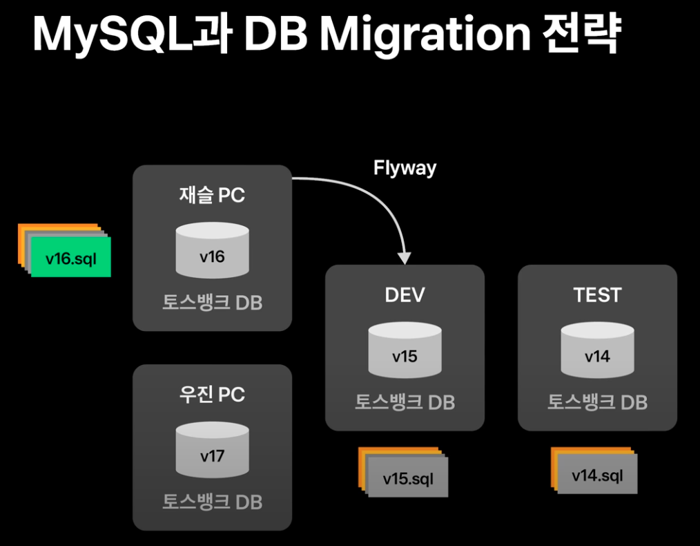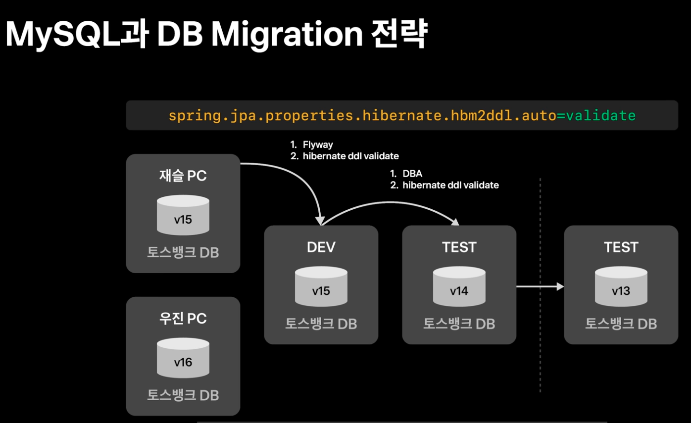 토스뱅크는 시스템 초기부터 Flyway와 Hibernate의 DDL Validation을 적용했다. 위 사진을 보면 재슬 PC는 버전 16의 마이그레이션 파일을 가지고 있고 DEV는 15, TEST는 14를 가지고 있다. 이 때 재슬 PC 브랜치가 DEV에 머지되면 DEV의 마이그레이션 파일의 버전이 16으로 올라가고 DEV가 TEST에 머지되면 TEST도 16버전으로 올라간다.