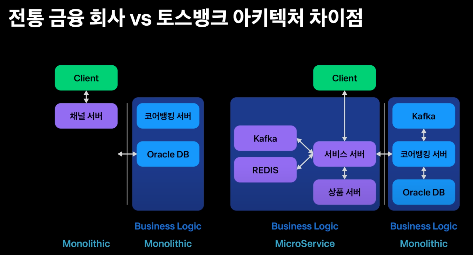 (왼쪽 아키텍처) 기존 금융권의 경우 대부분의 비즈니스 로직이 계정계라고 불리는 모놀리틱 코어뱅킹 시스템내에 구현된다. 전통적인 금융권 아키텍처에서 채널계라고 불리는 서비스 서버는 사용자와 연계해 제품을 사용하는데 필요한 요청과 응답을 코어 뱅킹 시스템의 전문 규격에 맞게 변환하고 전달하는데에 중점을 두고 있었다.