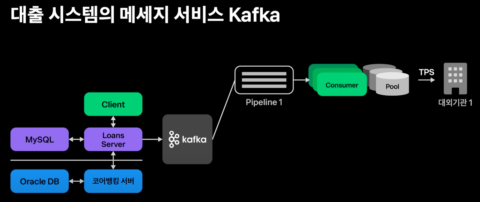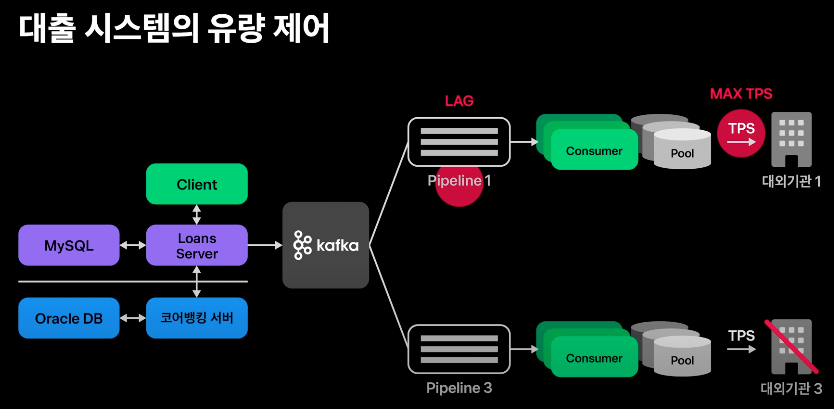대출 시스템은 고객의 신용평가와 소득산출을 위해서 여러 대외기관과의 협업이 필요하다. 과거 새로운 은행이 오픈하면 이런 대외기관들이 신규 은행의 트래픽을 감당하지 못해 많은 트래픽이 대외기관에 유입되어 한동안 대출신청이 동작하지 않는 등 문제가 생기는 일이 많았다. 토스뱅크는 구축 초기부터 대외기관들이 견딜 수 있을 만큼의 트래픽을 전달하는 파이프라인과 유량 제어 시스템을 적용했다.